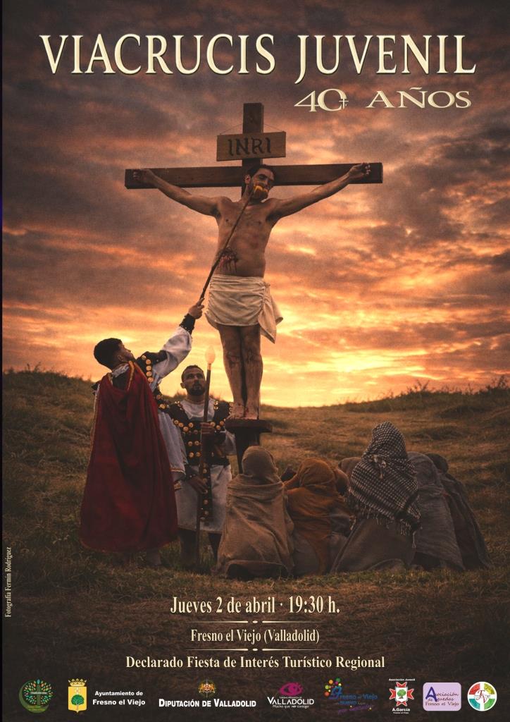 El cartel del Viacrucis Juvenil, una escena emblemática que este año celebra su 40 aniversario como representación participativa de la Pasión de Cristo, con numerosos vecinos jóvenes implicados en su desarrollo.